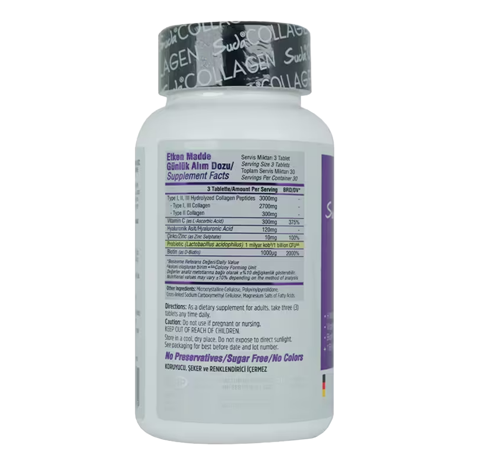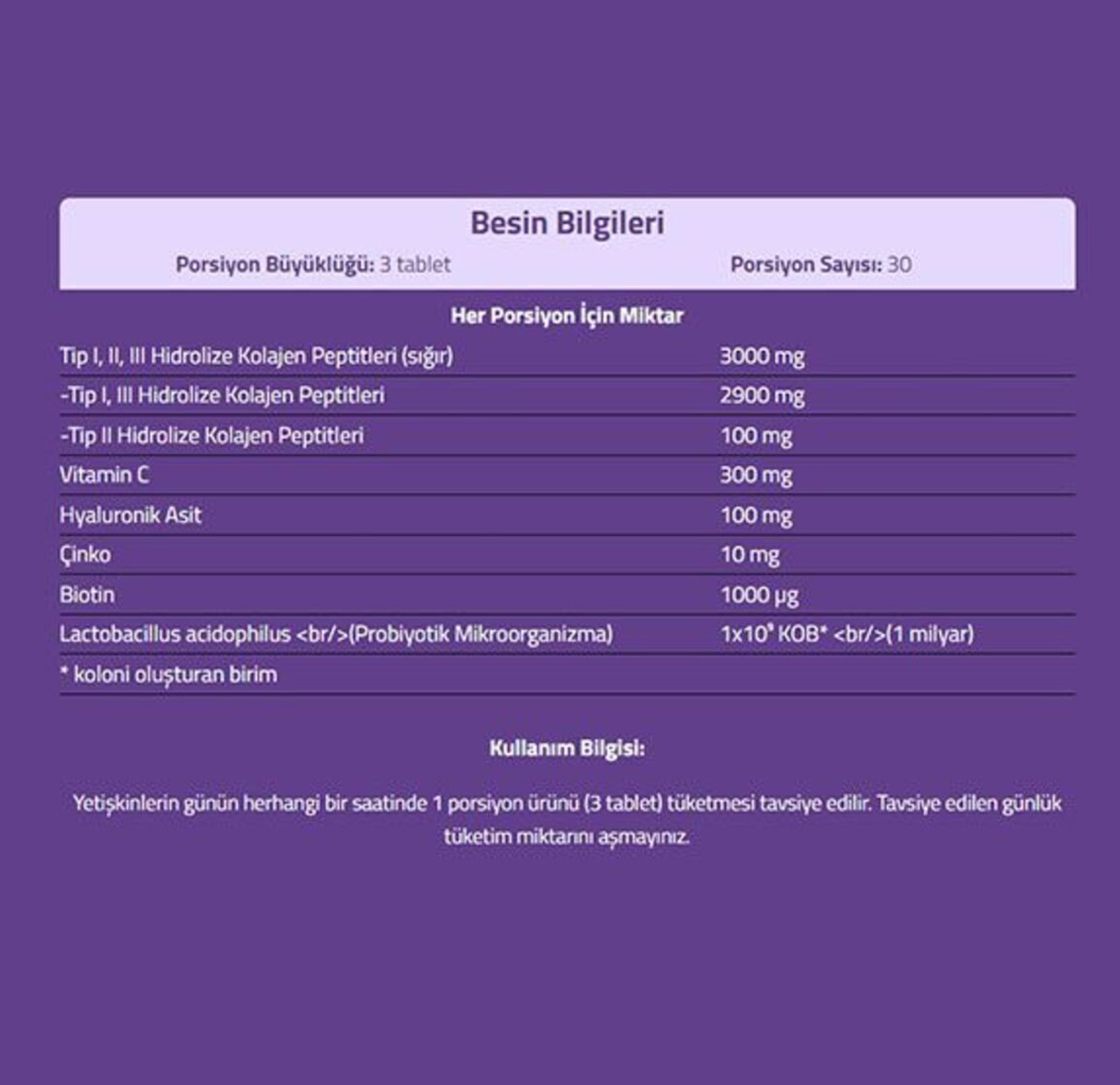 كولاجين ملتي فورم هو مكمل غذائي متطور يأتي في عبوة تحتوي على 90 قرصًا. يتميز هذا المنتج بأنه الأول في تركيا الذي يجمع بين 3 أنواع من الكولاجين المُحلّل (ببتيدات) في قرص واحد، مع تركيز عالٍ من المكونات النشطة لدعم الجمال والصحة.