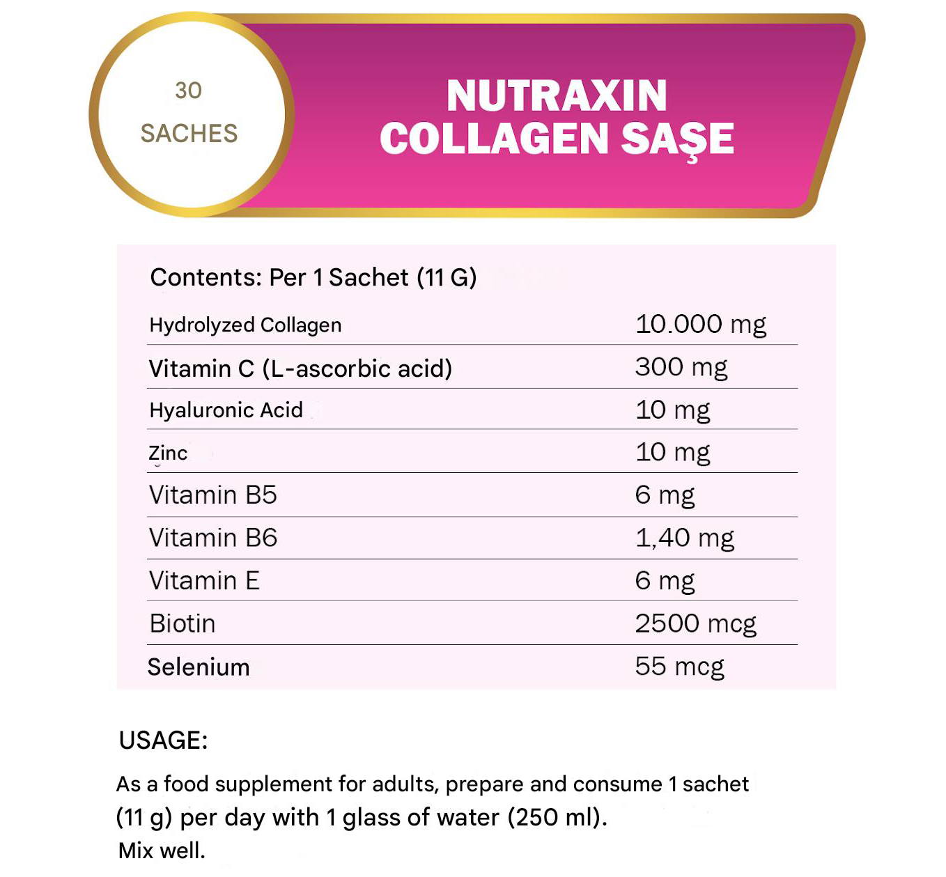 طريقة الاستخدام: للبالغين كمكمل غذائي، قم بتناول ظرف واحد (11 جرام) يوميًا، بتحضيره مع كوب من الماء (250 مل). يُرجى الخلط جيدًا قبل الاستهلاك.