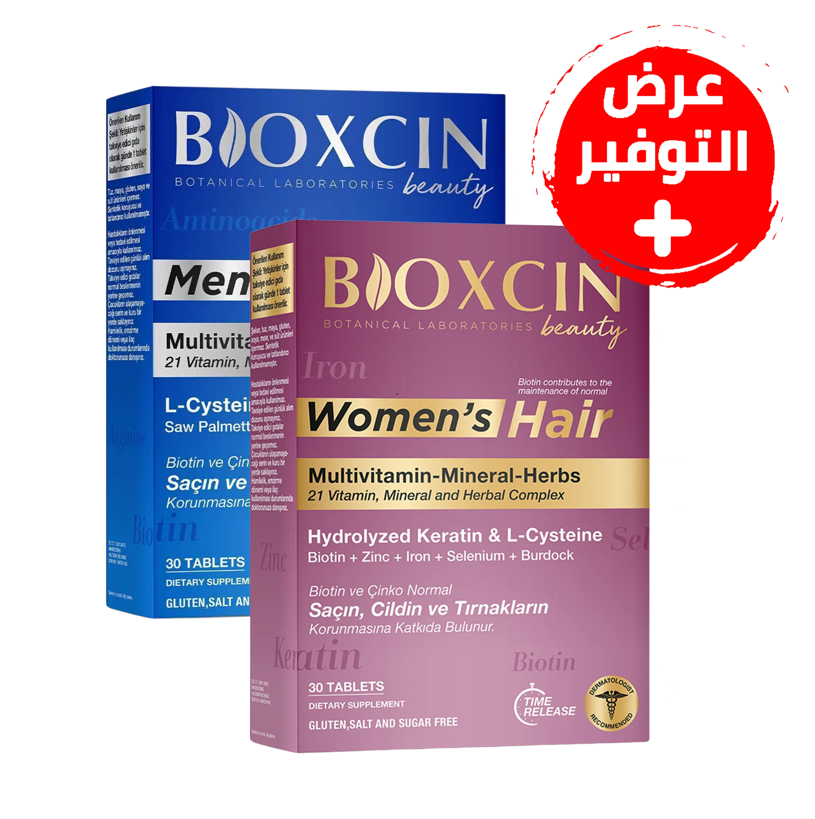 عرض أقراص Bioxcin فيتامينات متكاملة لشعر السيدات (30 قرصًا) + فيتامين متكاملة لشعر الرجال (30 قرصًا)